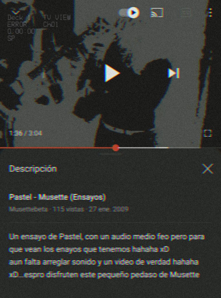 Mañana es lunes otra vez, tendré que verte en la escuela, con tu sonrisa fingida y flasfema, es el dolor en tus ojos que anhela, devorar mi alma y mis penas. -Pastel, Musette (2009).